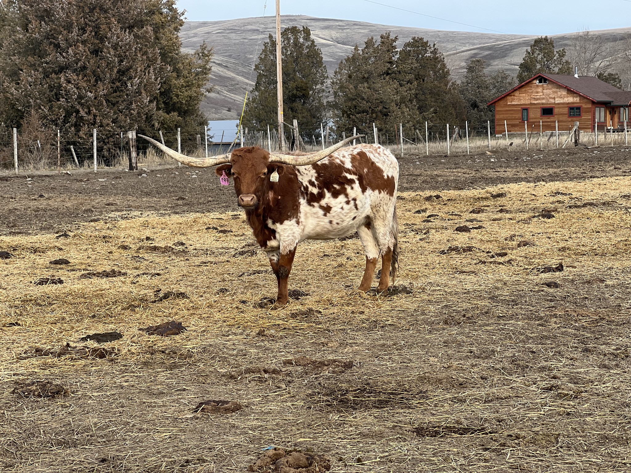Very feminine young heifer with horn coming in fast. This heifer has the disposition of a pet…her offspring will be gentle.